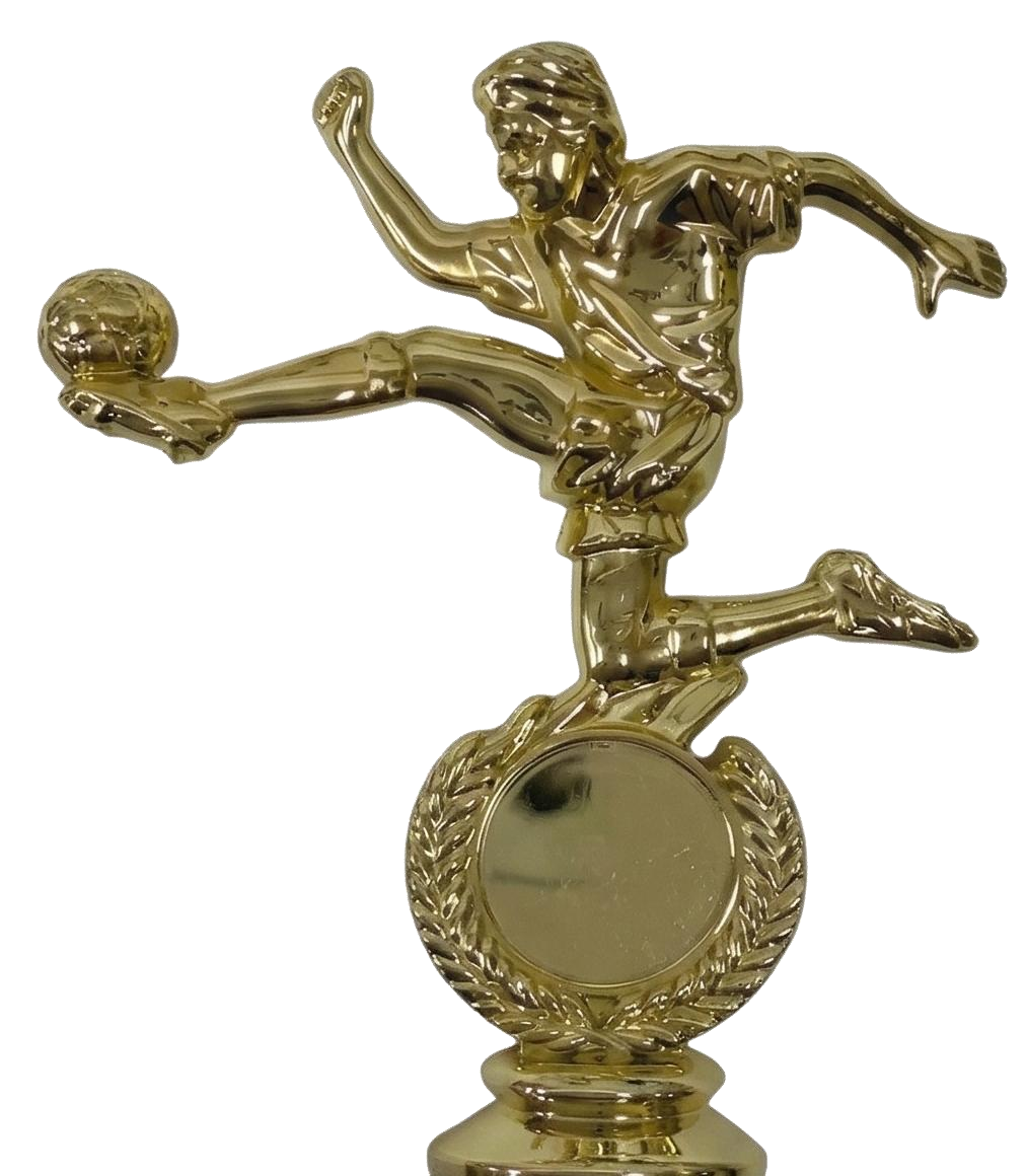 גביע מוגבה זהב — פסלון כדורגלן בועט מעל רוזטה עם לוגו, על בסיס יהלומי מגולף. זמין בשני גדלים. כולל לוחית הקדשה מתכת.